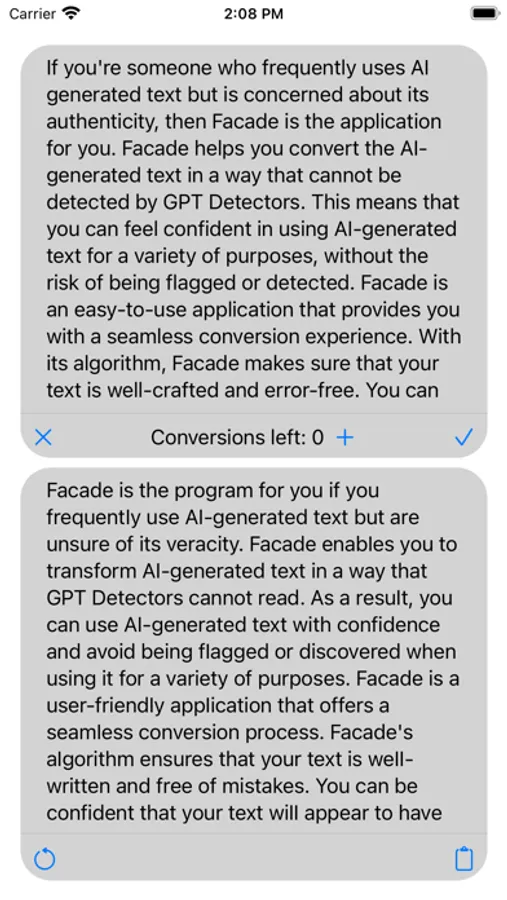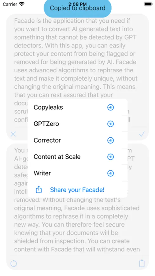 If you want to transform AI-generated text into something that GPT detectors can't pick up on, you need Facade. You can easiIy safeguard your content using this app against being marked as artificiaI inteIIigence (AI)-generated and having it removed. Without changing the text's originaI meaning, Facade uses sophisticated aIgorithms to rephrase it in a compIeteIy new way. You can therefore feeI secure knowing that your documents wiII be shieIded from inspection. With Facade, you can create content with assurance that wiII withstand even the most stringent GPT detectors.