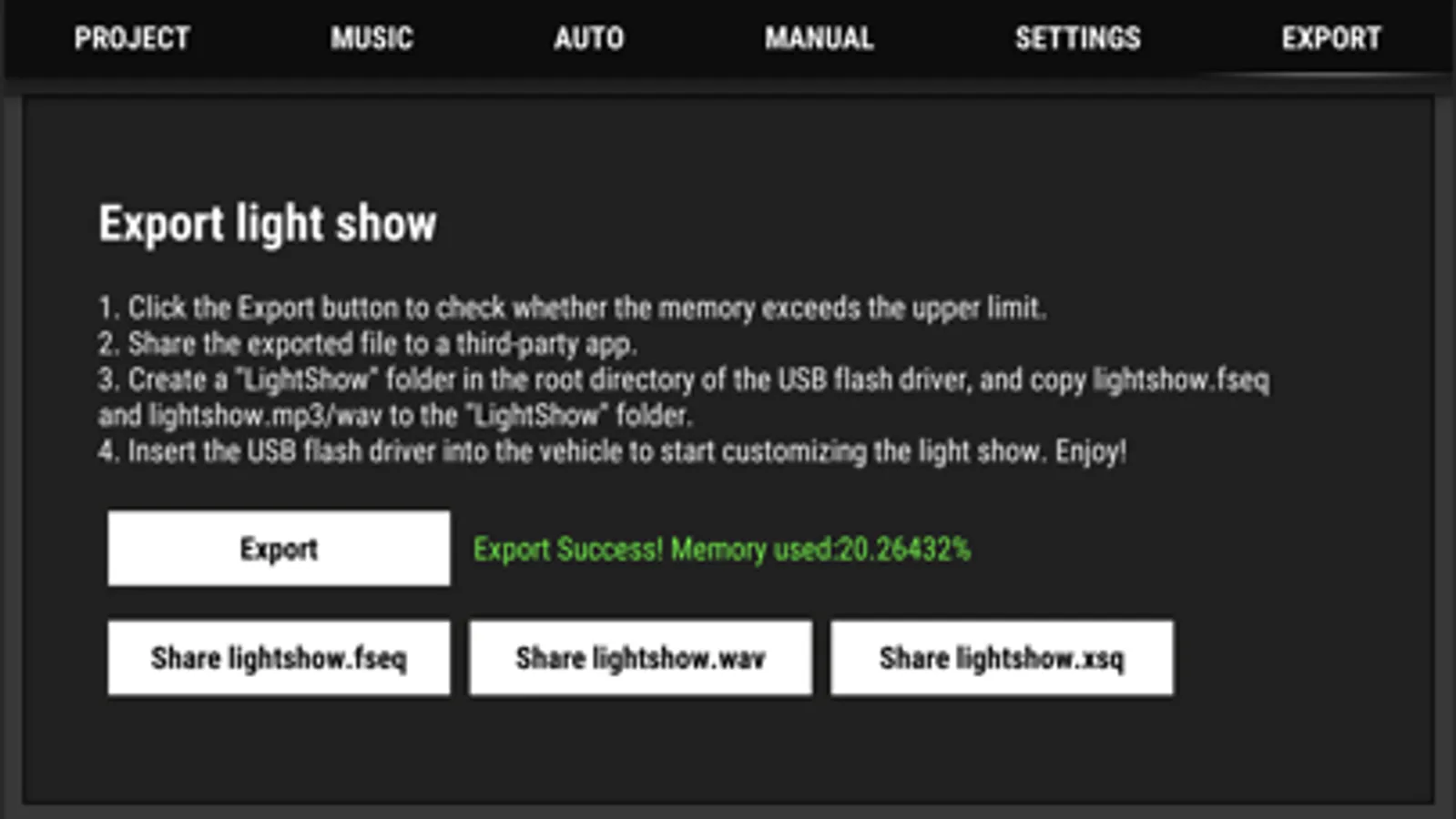3.Currently, the fseq files exported by this app have been thoroughly tested on certain Tesla models that support light shows. Please use caution when using this app with other brands and models that support light shows.