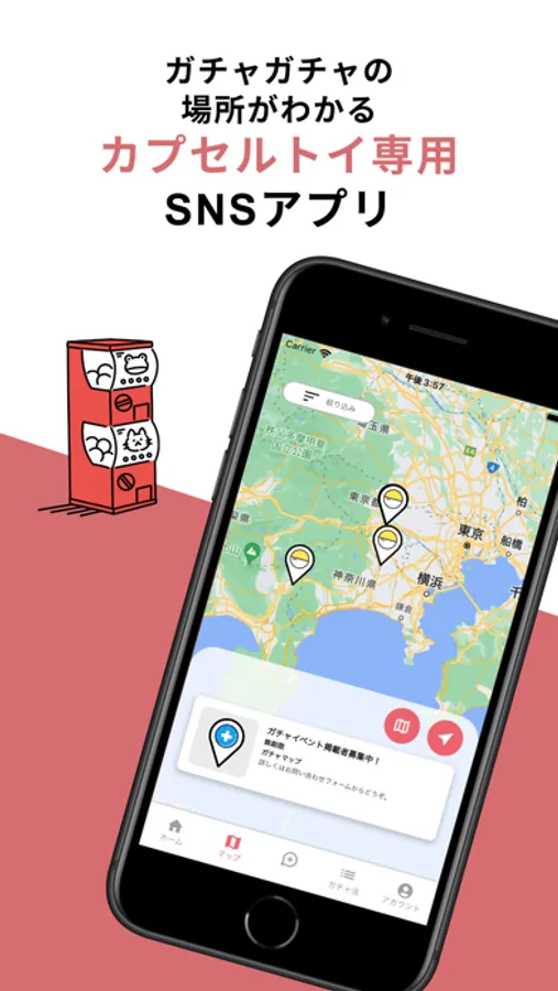 ガチャガチャ/カプセルトイ専用のSNSアプリです。皆さんが投稿した位置情報をもとに、ガチャガチャマップが創られます。