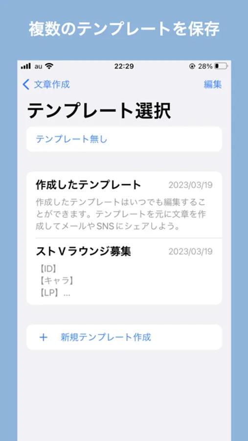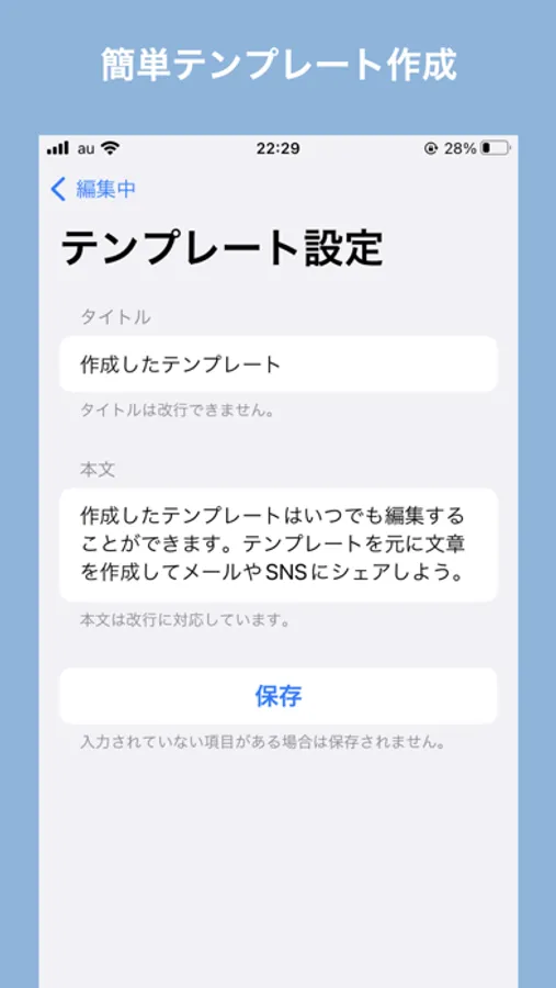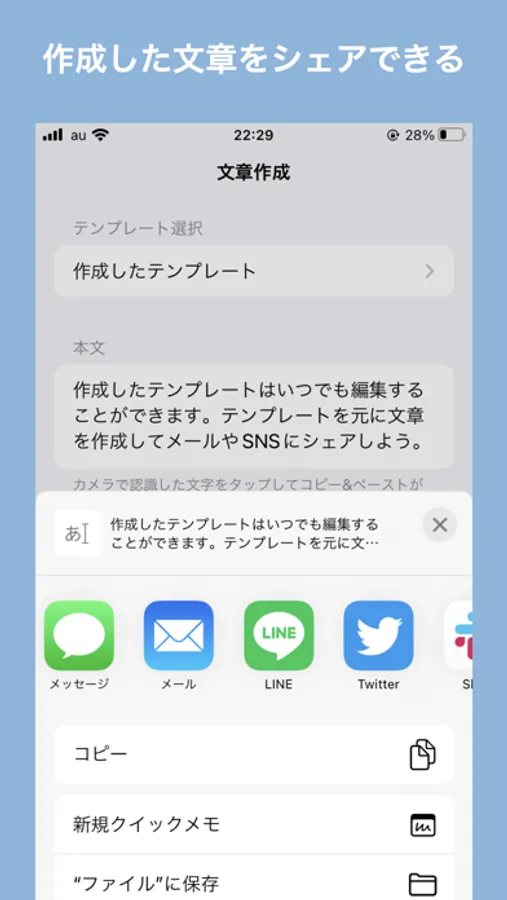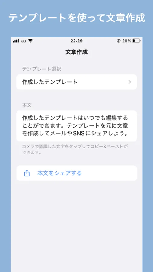 自分で作成した文章テンプレートを使用して作成した文章を、シェア機能で対応したアプリに投稿するアプリです。