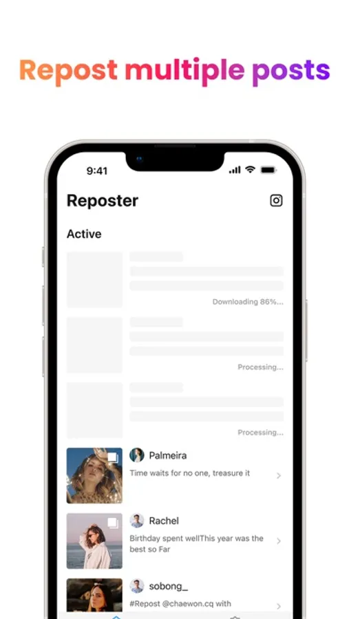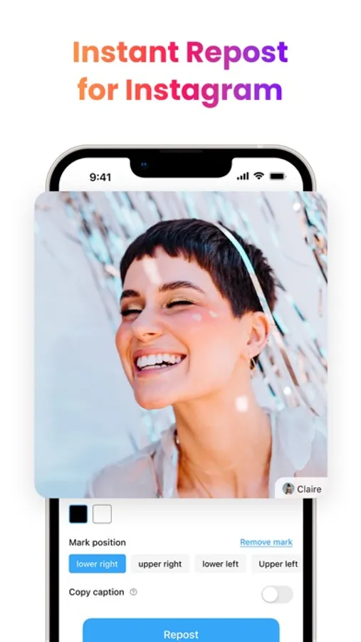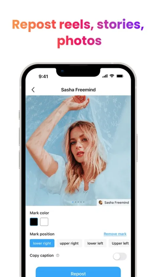 Reposter for Instagram helps you quickly repost ANY post from Instagram: photos, videos, reels, stories, and music.