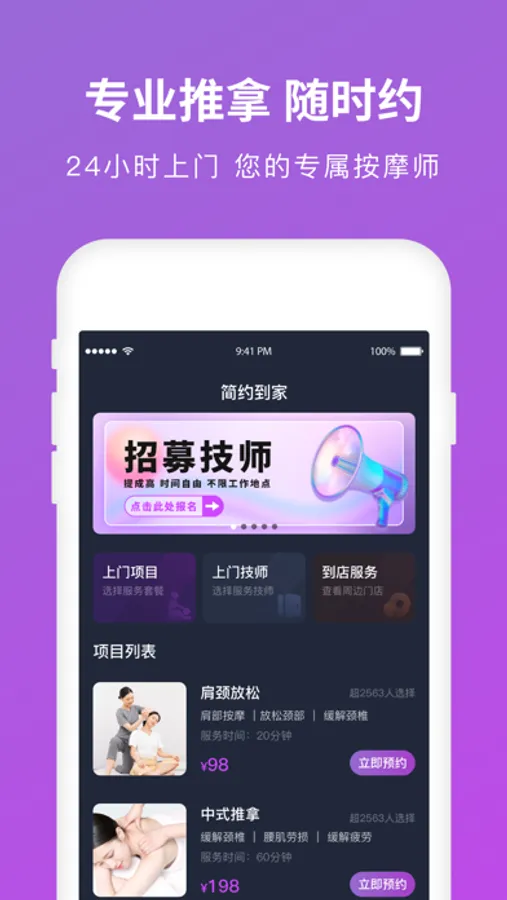 简约到家App是按摩行业全新服务平台,汇聚了各个领域的人才,通过他们的专业技能,为用户提供省心、靠谱、优质的服务,为您带来更健康的生活。优质服务,值得体验。