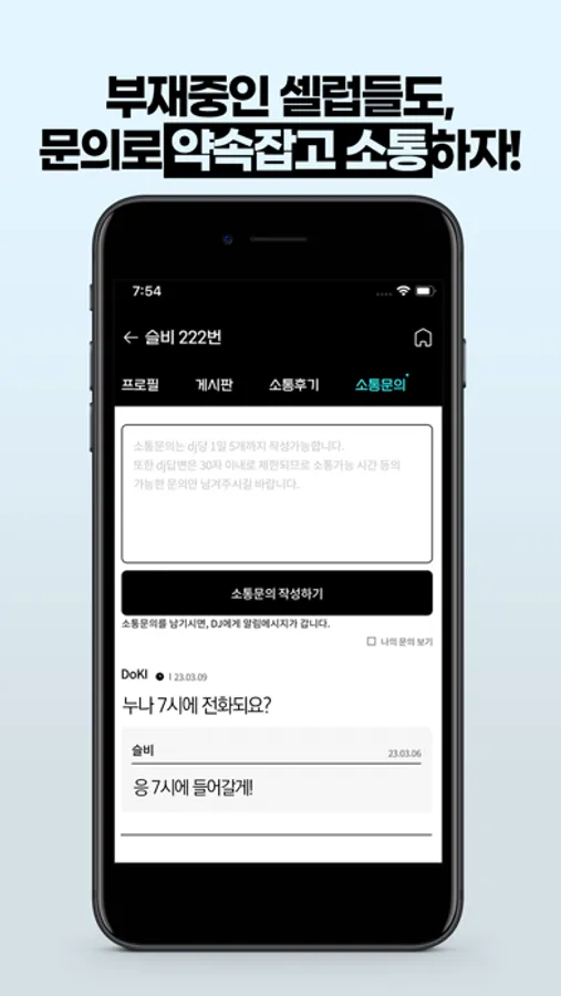 -부재중인 DJ와 '소통문의' 탭에서 약속을 잡을 수 있어요.