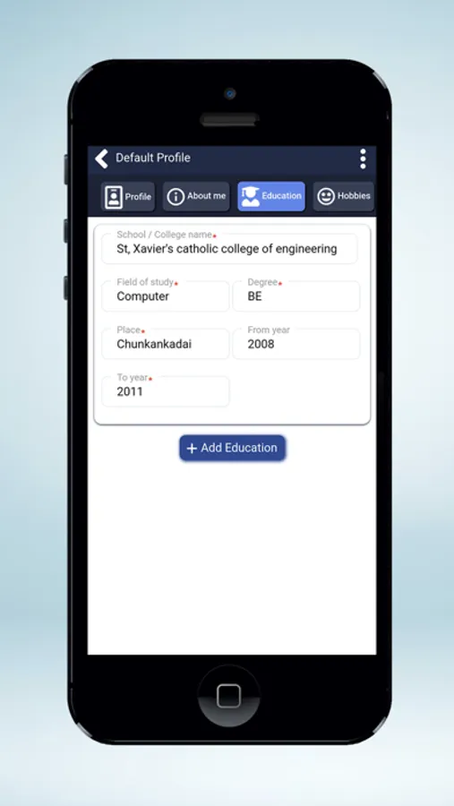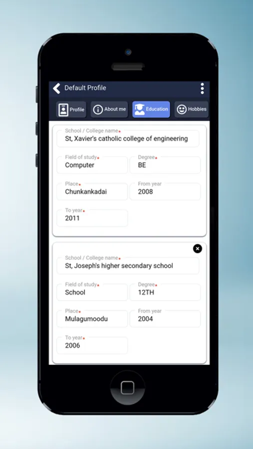 Education - Institution name, your marks and pass out year, and all the fields related to your previous and current education details can enter here.