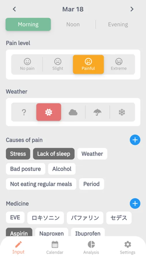 Just select the pain level, weather, cause of pain, medicines you have taken from the options and press the save button. The simple operation allows for stress-free use.