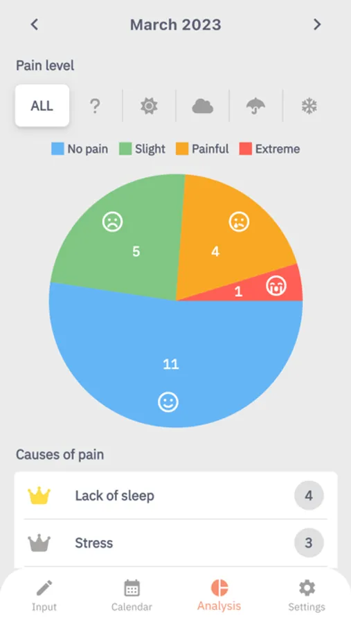 In the "Analysis" screen, you can check the trend of pain by weather and the causes of pain in a ranking format, which is useful for analyzing the causes of headaches.