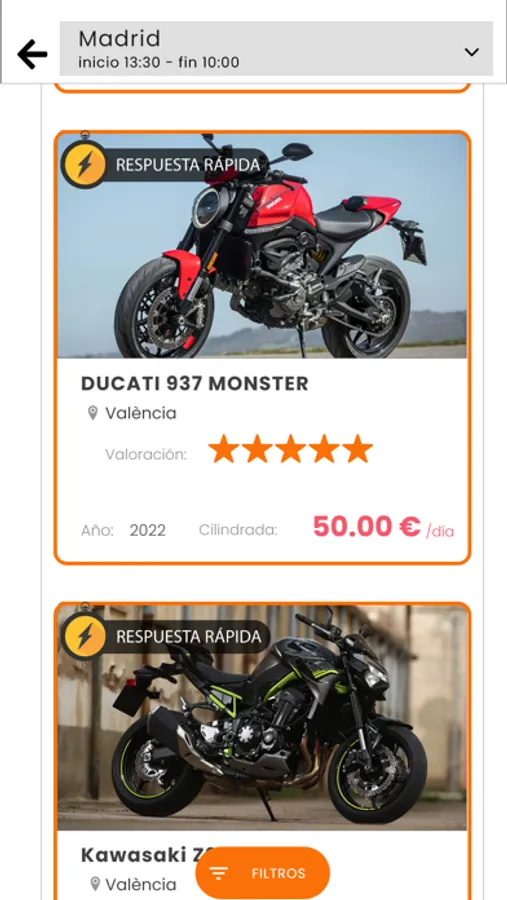 5) Once the location and date have been selected, you only have to choose the motorcycle that you like the most and want to rent.