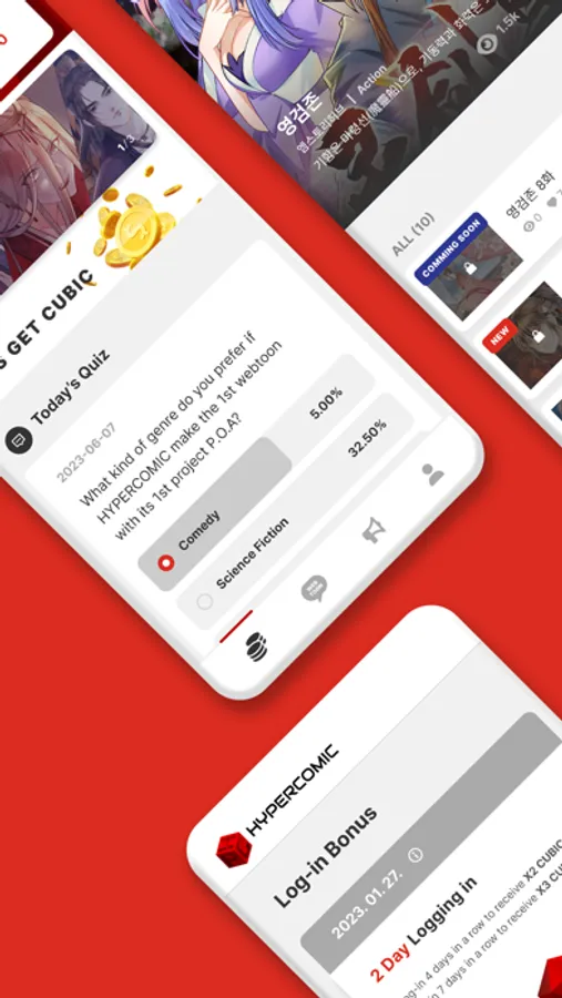 Simply by logging in every day, you can collect CUBIC! Just spending 10 minutes on quiz or games and you can enjoy Webtoons/Manhwa for free!
