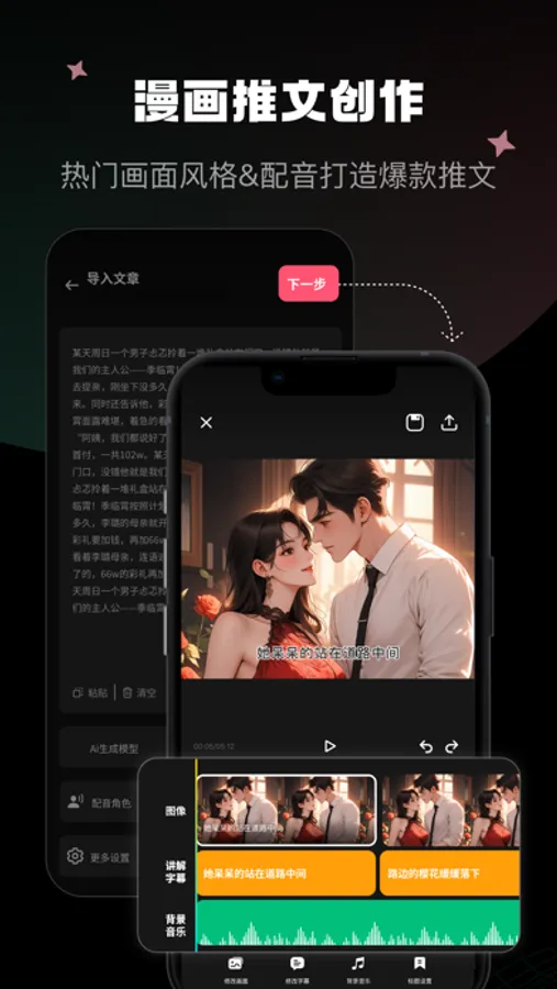 不同于传统的自动混剪工具,因为大家的素材都是基于素材库进行剪辑会导致素材被判重问题,利用我们生成的画面能够保证纯原创,同时我们的能够将用户输入的小说转化成漫画,保证画面与故事的贴合度以及连贯性。