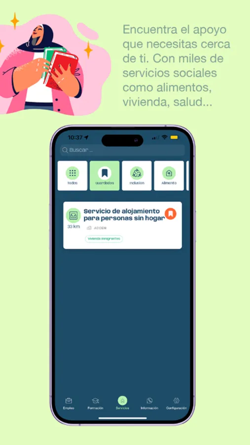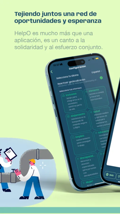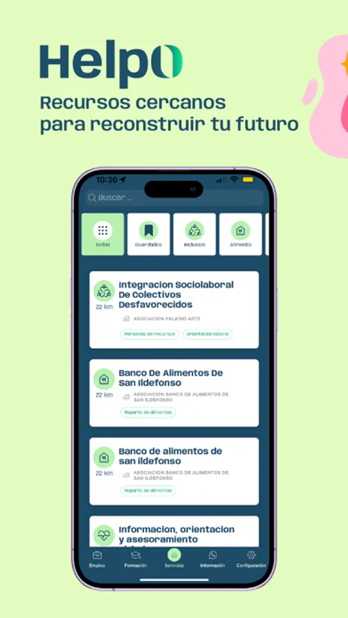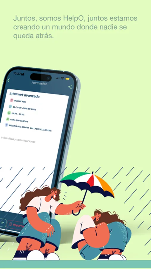 HelpO es una aplicación que ayuda a construir futuro a personas en situación de vulnerabilidad. Lo hace mostrando los recursos sociales que tienes cerca en función de tus intereses, enseñándote las distintas posibilidades de formación gratuita y ofreciéndote ofertas de empleo actualizadas.