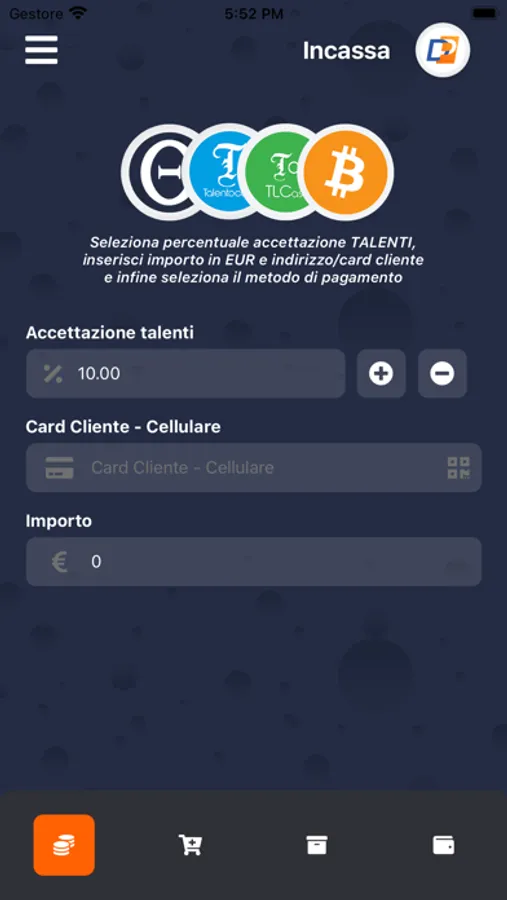 L’app è pensata per un utilizzo adatto a qualsiasi tipo di utente, ti permette di utilizzarla come pos ,su qualsiasi device accettando diverse cripto monete e ,permettendo al negoziante di erogare tanti servizi, che sia esperto o principiante, interfaccia dinamica ed intuitiva, ti aiuterà con pochi click ad ottenere l’erogazione del servizio desiderato.