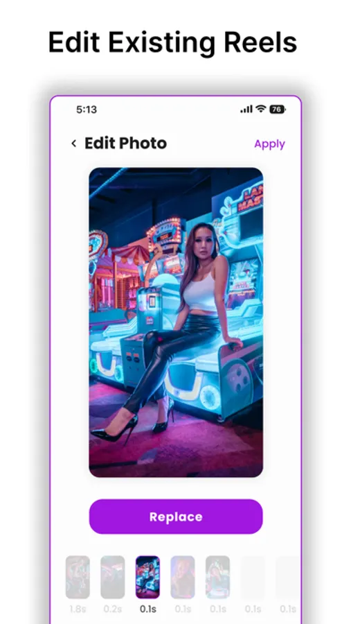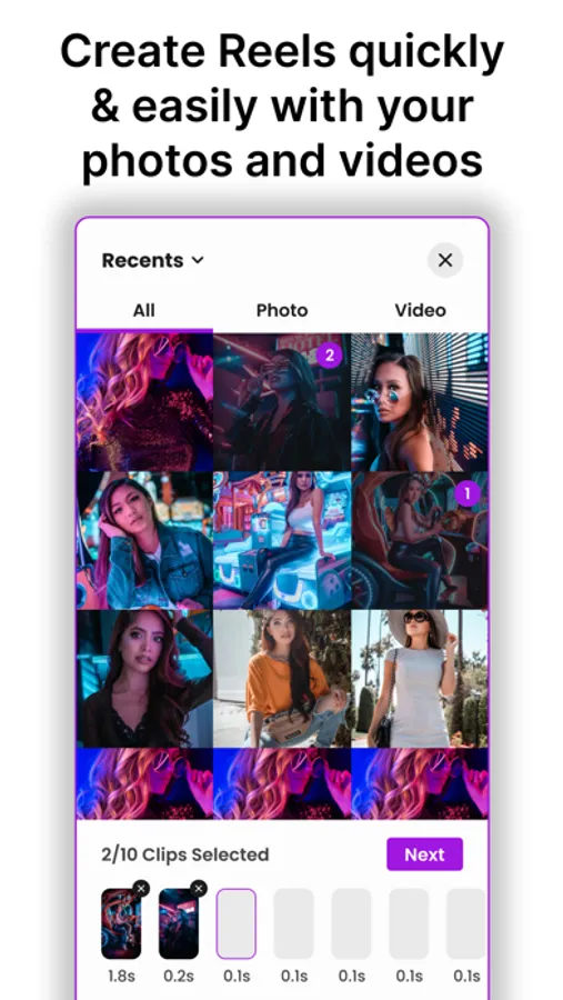 Create Reels in just a couple of clicks by simply uploading your photos and videos and let the app do everything for you.