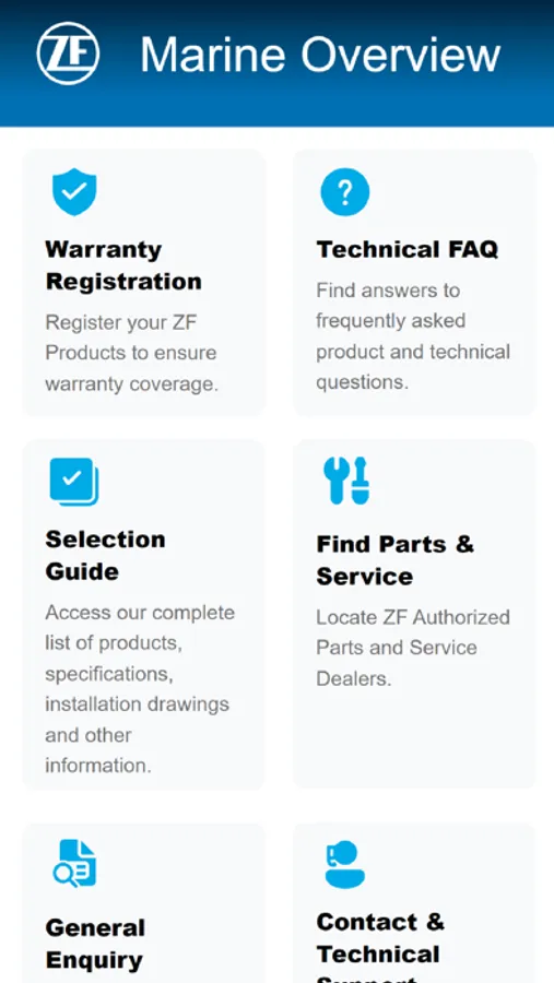 The ZF Marine App provides customers with ZF Marine Propulsion products useful links and product information including:Warranty Registration – Register your ZF Products to ensure warranty coverage.Technical FAQ – Find answers to frequently asked product and technical questions.Selection Guide – Access our complete list of products, specifications, installation drawings and other information.Find Parts & Service – Locate ZF Authorized Parts and Service Dealers.General Inquiry – Submit requests for general information or support. Technical Support – Contact us for technical support.