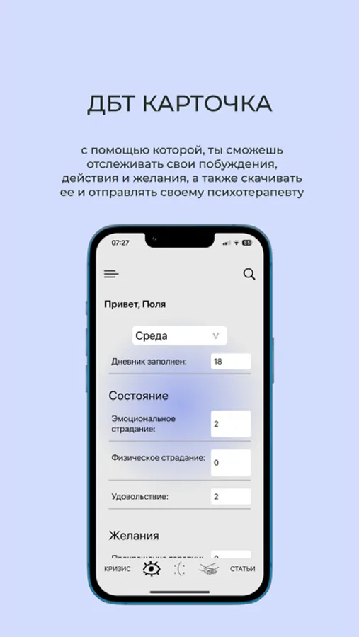 Данное приложение не заменяет терапию, но может помочь тем, кто проходит терапию, закончил терапию или быть карманной помощью для тех, кто еще не может позволить себе полноценную ДБТ терапию.