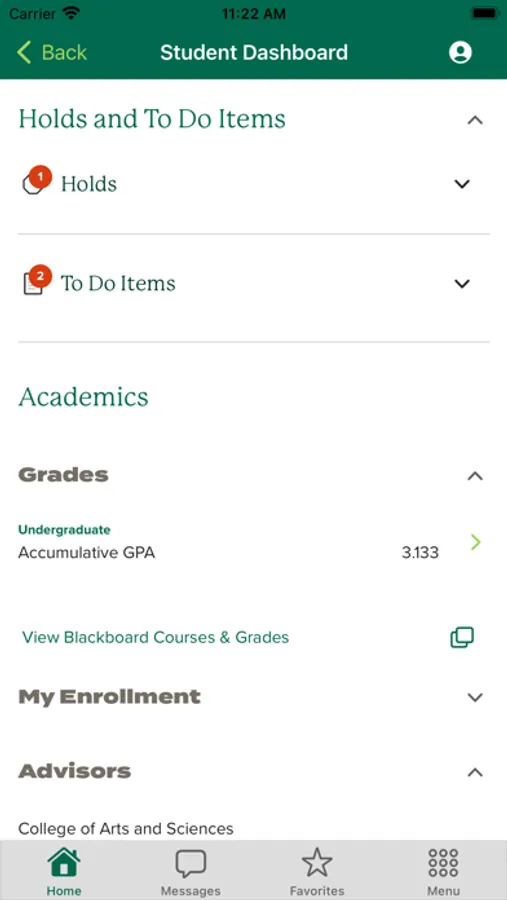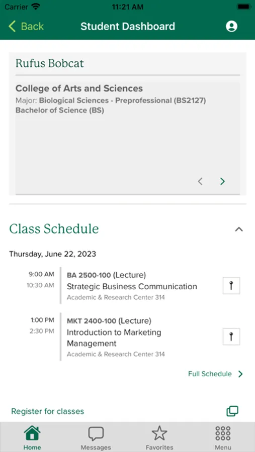 Students can log in to view a personalized Student Dashboard with information like class schedule, GPA, final grades, advisors, financial aid, account balances, holds, to-do tasks, meal plan balances and more. (A guest experience is also available.)