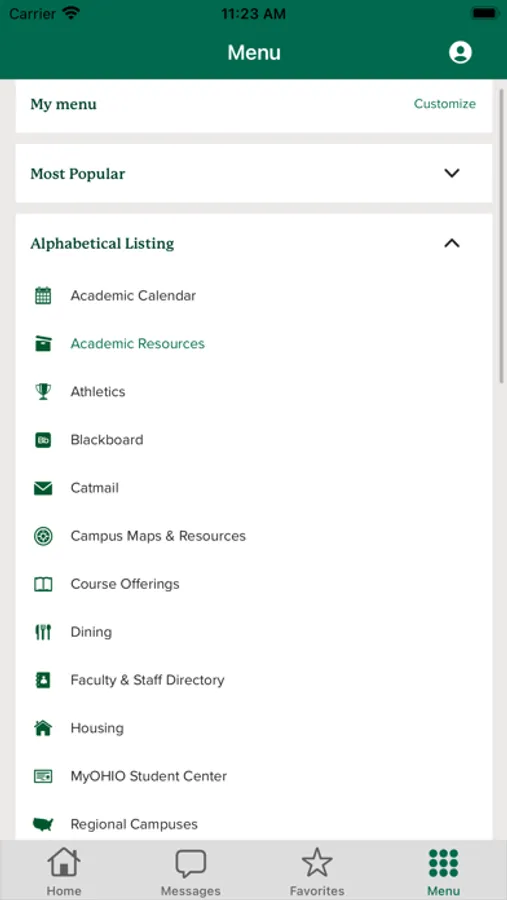 Go OHIO also includes access to academic and campus resources like maps, safety, well-being, transit, housing, dining, academic calendars and events, plus systems like Blackboard, Catmail, My OHIO Student Center, DARS, TracCloud, eAccounts, OneDrive, Bobcat Connect, Housing Self-Service, eRezlife and Handshake.