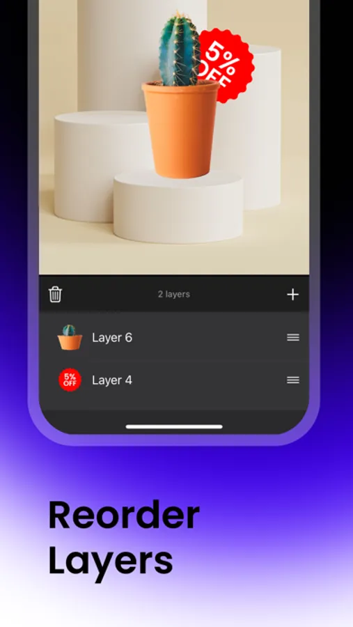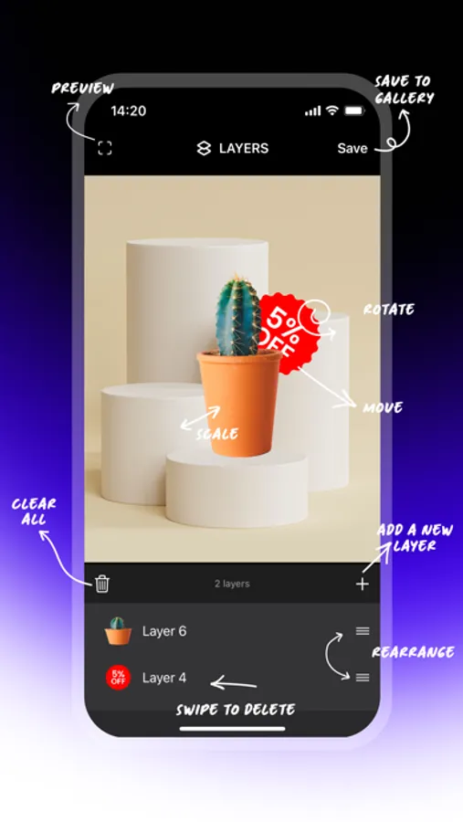 Using intuitive gestures, you can move, rotate, and scale individual image layers to achieve the perfect placement and composition. The app offers a seamless user experience that allows you to effortlessly switch between layers and reorder them to achieve your desired look.