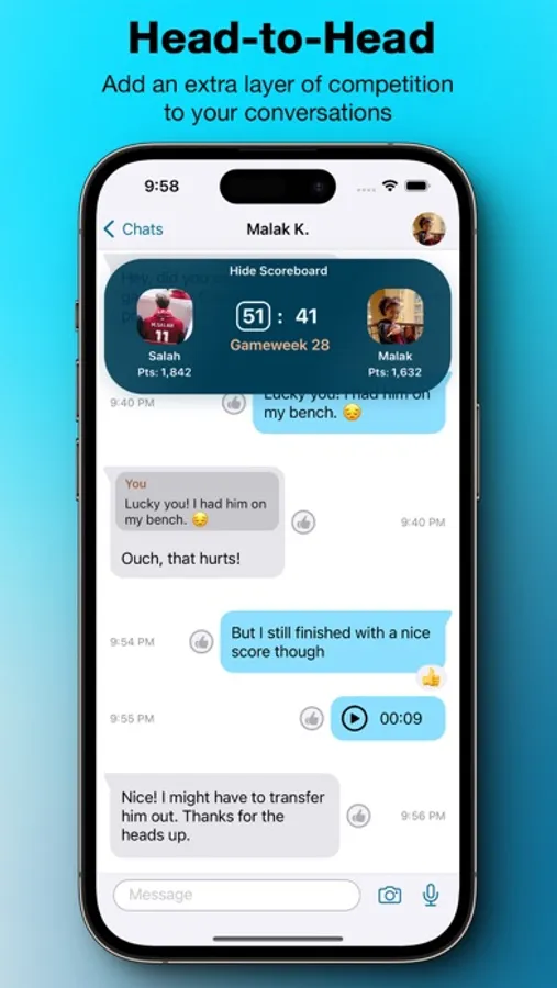 But wait, there's more! Individual chats just got spicy. Our scoreboard pits you against your chat buddy each Gameweek. A dash of friendly rivalry to spice up the conversation. Can you outscore them and claim victory? The chat will tell.