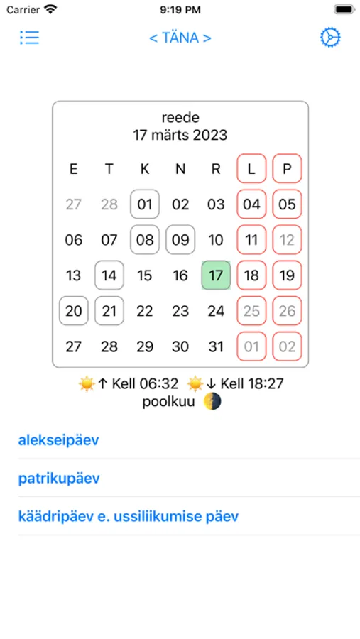 - asukoha valik Päikese ja Kuu andmete arvutamiseks.