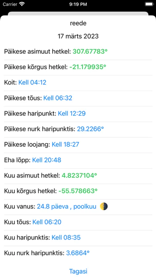 - Päikese ja Kuu kohta - tõus ja loojang, asukoht hetkel, nurk hetkel, millal on haripunktis jne.