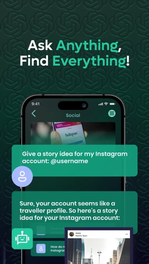 With our Ask AI app, you can use all aspects of artificial intelligence such as post ideas for Instagram, Twitter threads, video ideas and getting an answer to every question you ask for your assignments.