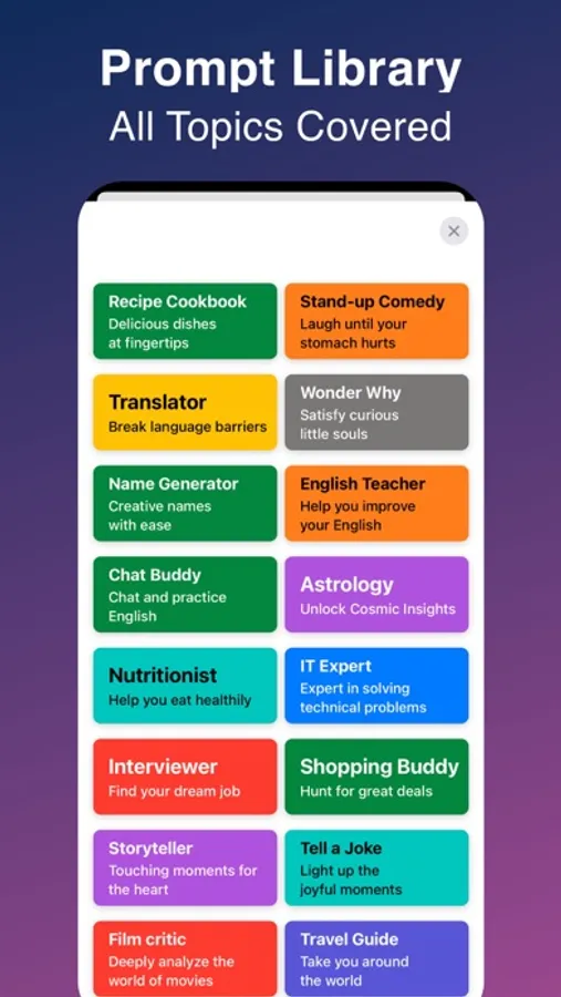 - Rich themed features: Offering a range of practical prompts, such as naming, horoscopes, translations, recipes, and more to meet your diverse needs in life and learning.