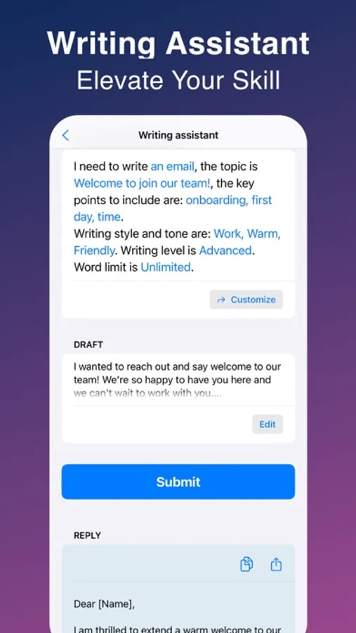 - AI-powered writing assistance: Our App utilizes advanced AI technology to provide intelligent writing guidance and suggestions for various forms of writing, such as emails, essays, and messages, helping users improve their English writing skills.