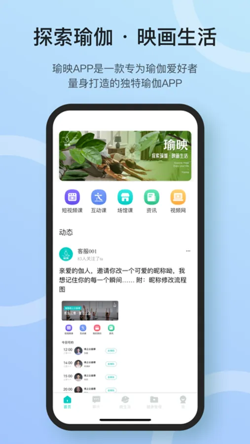 瑜映APP是一款专为瑜伽爱好者量身打造的独特瑜伽App。"瑜映-探索瑜伽,映画生活",寓意着我们希望能通过瑜伽的练习和哲学,帮助用户在生活中寻找内心的平静、意义和成长。