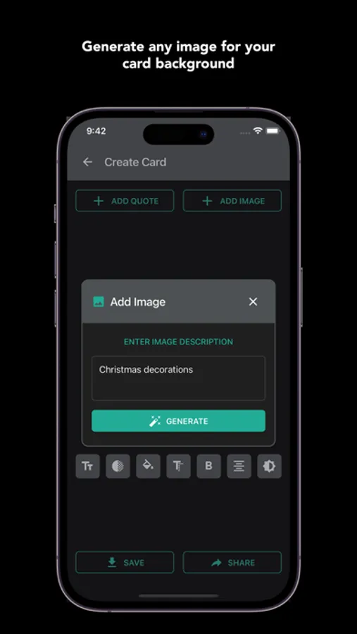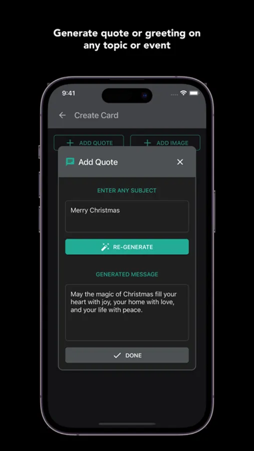 Quickly generate custom greeting cards with AI. Generate quotes and background images on any topic or event, edit the design and share with your friends easily. Powered by GPT 3.5 and DALL-E.