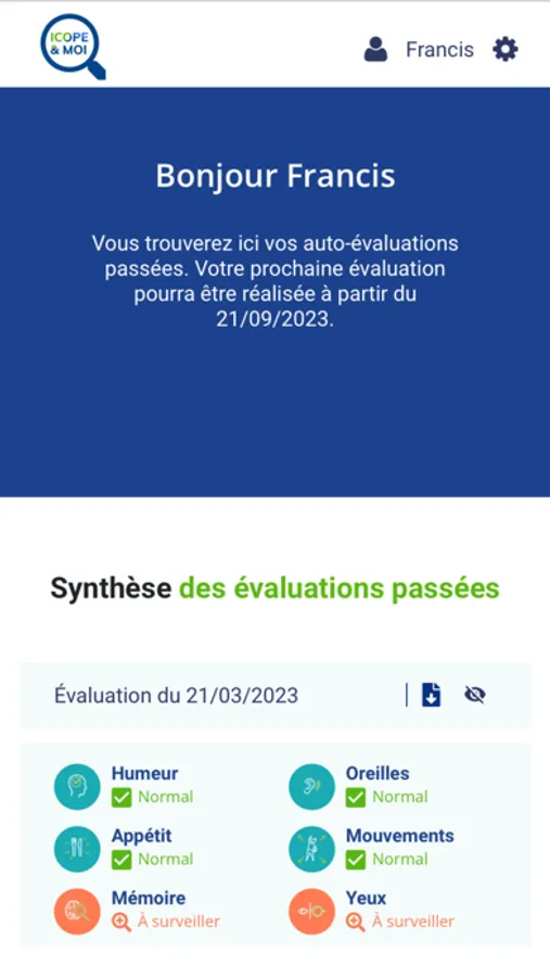 L'application ICOPE et Moi vous permettra de créer votre compte, de vous évaluer afin de comprendre quelles sont les capacités pour lesquelles vous devez consulter un professionnel.