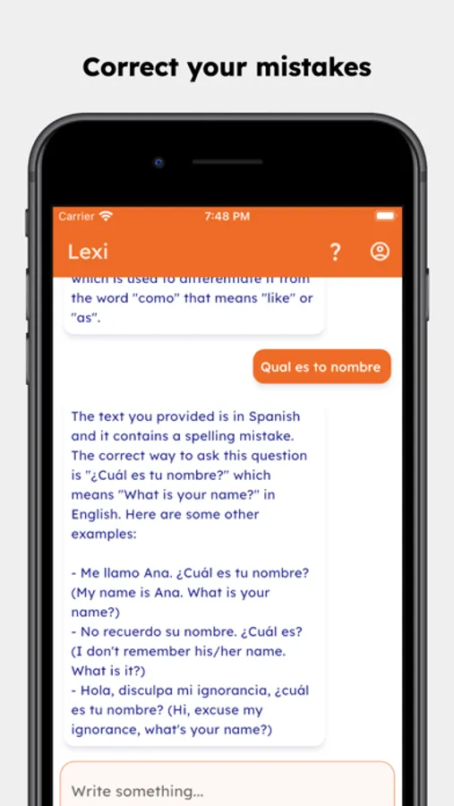 1. Corrections: Eliminate grammar mistakes and mispronunciations with Lexi's advanced AI language correction feature. Get real-time feedback on your written and spoken communication, ensuring you improve your language skills effectively. For example, if you write "She don't like apples," Lexi will correct it to "She doesn't like apples."