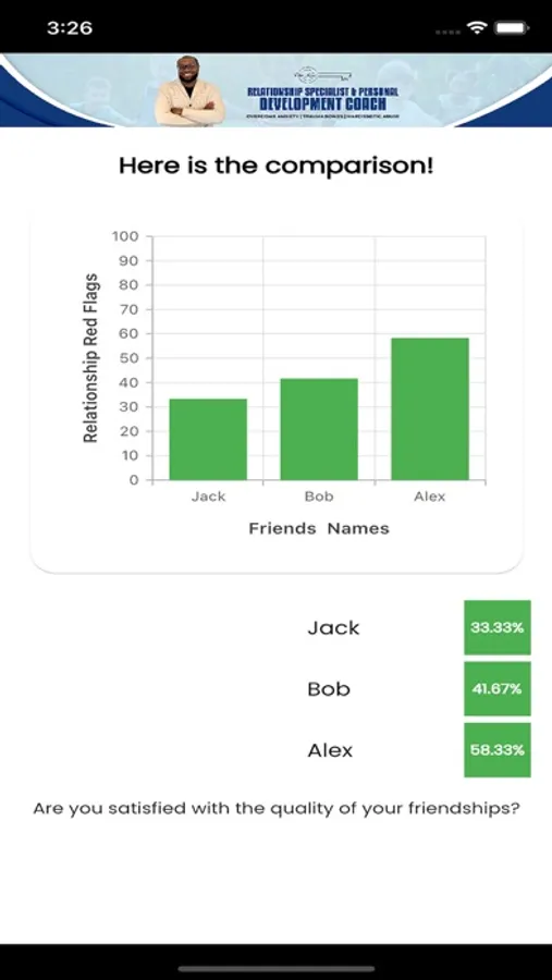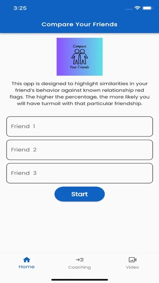 This app is designed to highlight similarities in how your friends interact with you. You will be able to compare the behaviors of up to 3 of your friends at a time. At the end of the assessment you will be presented with a graph that compares their behavior against known relationship red flags.