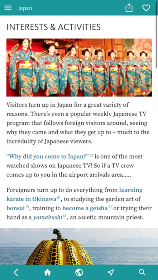 The app’s next section, INTERESTS & ACTIVITIES, gives you the heads-up on various topics, so if you’re keen to explore the country’s GARDENS; planning some HIKING; or want to know all about TRADITIONAL ARTS & CRAFTS, then you might just dive straight into the app here.
