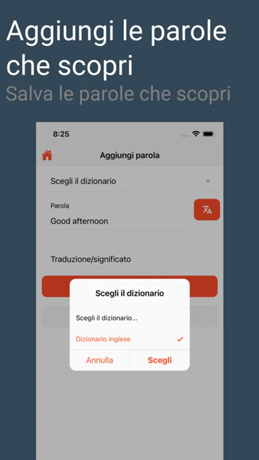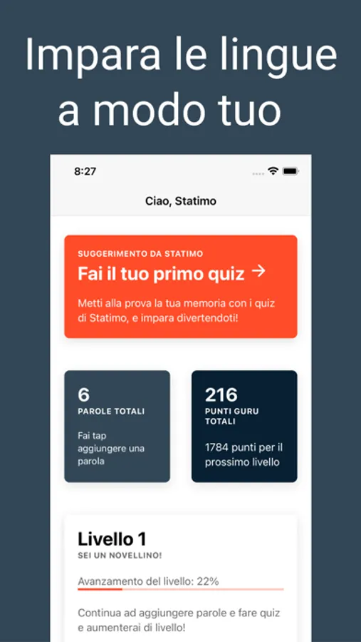 Statimo è l'app che ti aiuta a imparare le lingue costruendo e allenando il tuo vocabolario personale. Qualsiasi lingua ti interessi, Statimo ti permette di tradurre e salvare facilmente i vocaboli che incontri ogni giorno. Così crei un dizionario personale e sempre a portata di mano.
