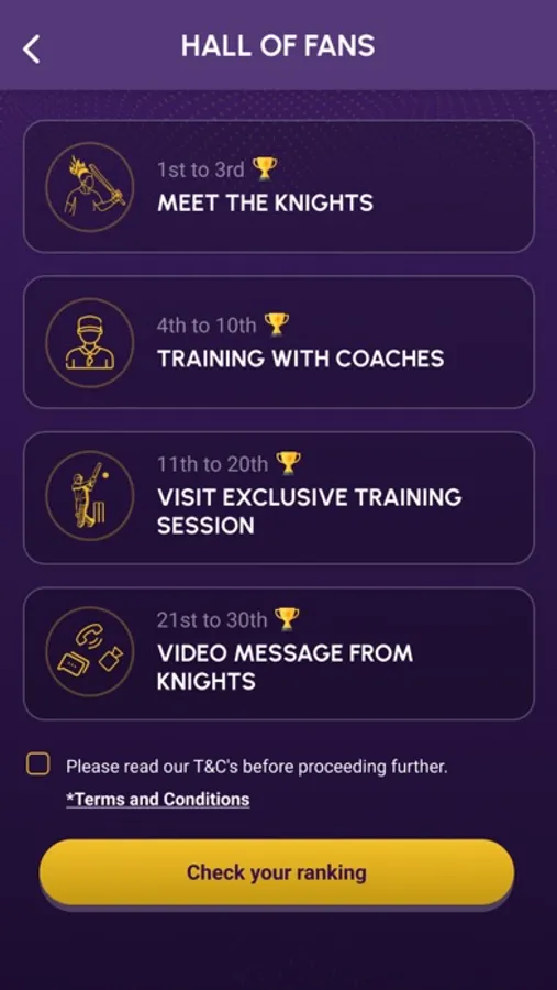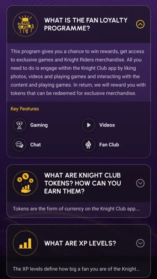 - Fan Loyalty Programme: The KKR Fan Loyalty Programme is designed to reward fans for their dedication and engagement with the team. By using the app regularly and participating in various activities, fans can earn badges, XP points, and Knight Tokens, and unlock exclusive rewards that are not available anywhere else, like exclusive merchandise, souvenirs, and experiences like meeting the players.