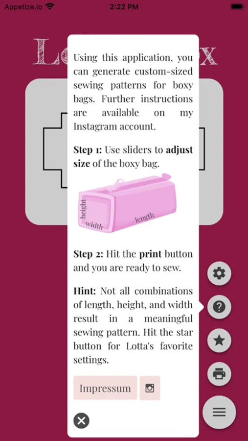 Looking to create your own Boxy Bags but struggling with getting the right measurements and configurations? Our app is here to help! With our easy-to-use interface, you can customize your Boxy Bag pattern with your desired measurements and then print it out for easy sewing. Whether you're an experienced crafter or just starting out, our app is the perfect tool to help you create the perfect Boxy Bag every time. Try it out today and get started on your next project!