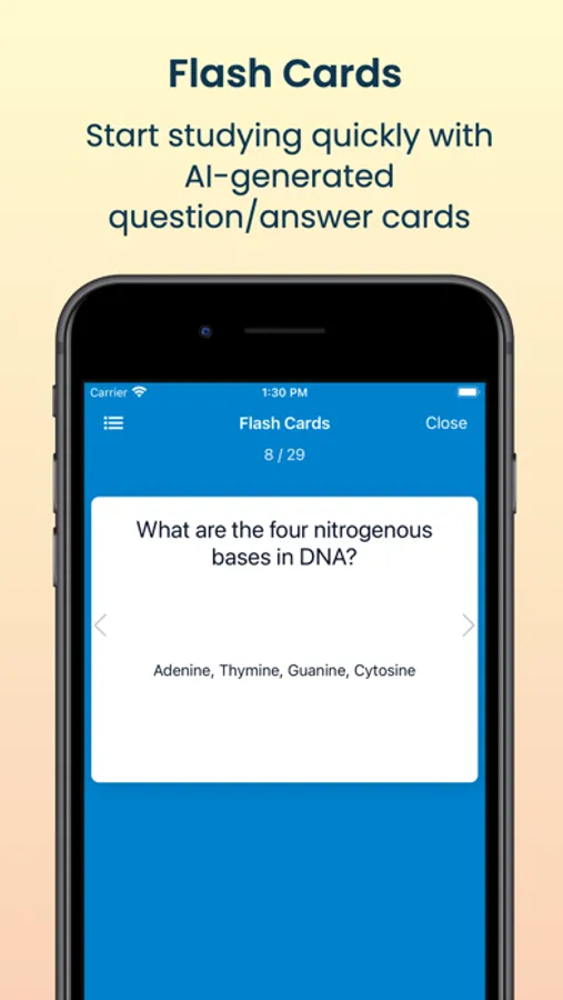 • Create Flash Cards: Generate a customized set of question and answer cards from a section of text or by typing in topics.
