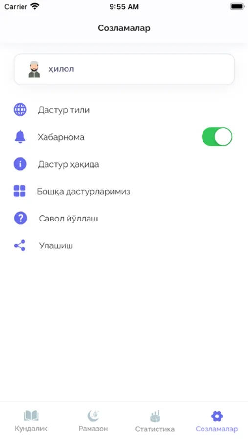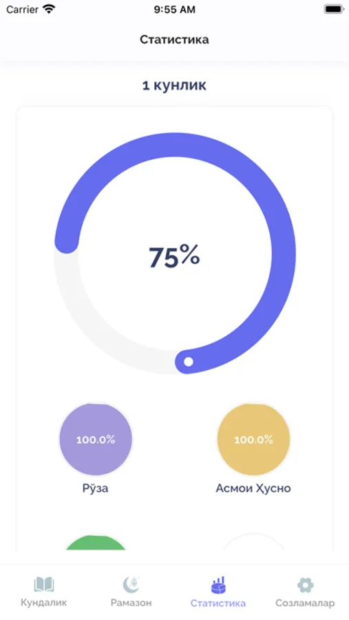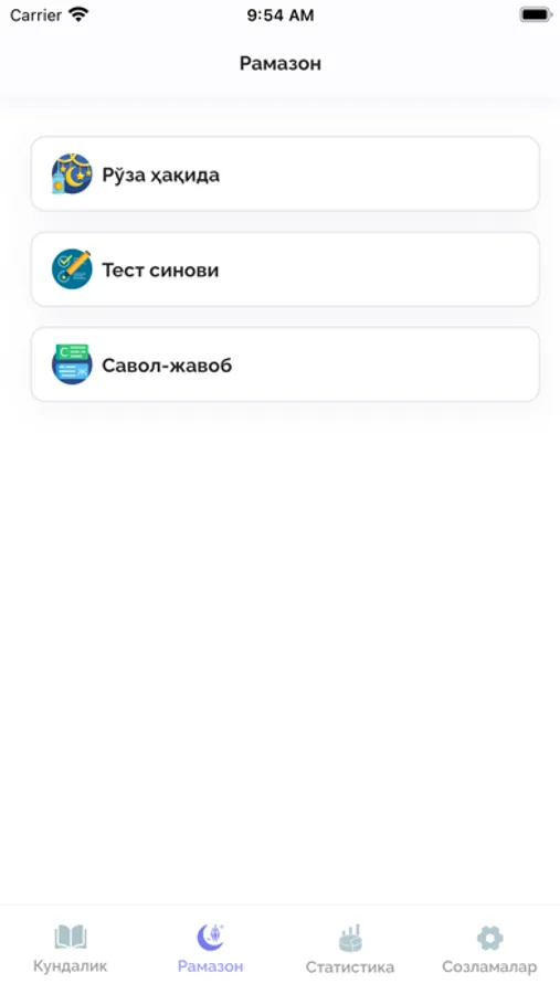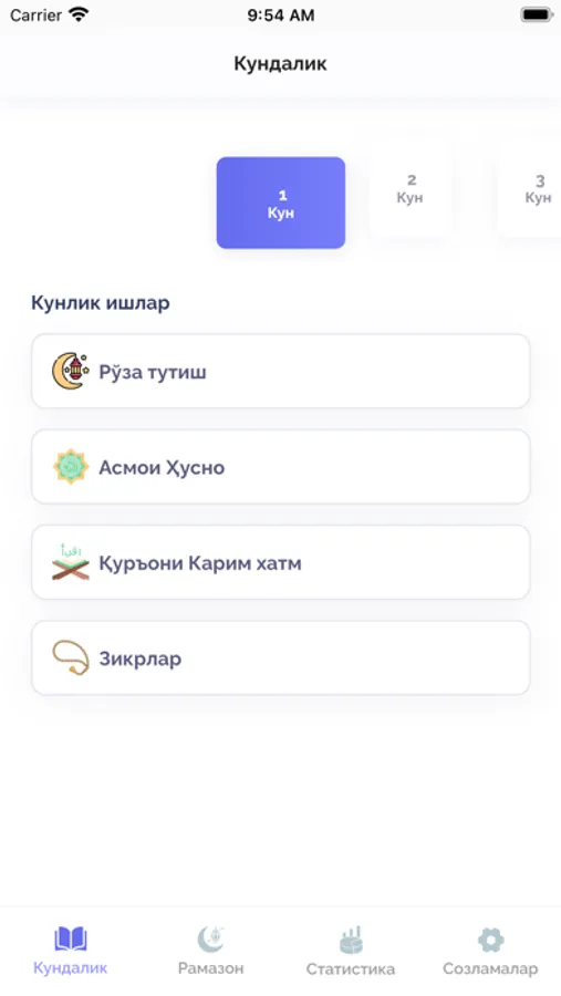 Рамазон кундалиги дастури орқали сиз рамазон ойида тутилиши керак бўлган рўзани, Қуръон тиловати ва зикрларни қайд эътиб боришингиз мумкин. Ҳар куни Рамазон ойининг бошидан бошлаб то белгилаган кунингизгача бўлган статистикани кўриб, назорат қилиб боришингиз мумкин. Ойнинг охирида эса сиз қанча рўза тутганингизни, Қурони Каримни неча пора ўқиганингизни, Рамазон ойида қанча зикр қилганингизни, Асмаул ҳуснани қанчасини ёдлаганингизни статистика саҳифасида кун ҳисобида фоизларда кўриб таҳлил қилишингиз мумкин. Бу дастурда рўзага доир муҳим маълумотлар, рўзага доир савол жавоблар ва рўзага доир тестларни ечишингиз мумкин.