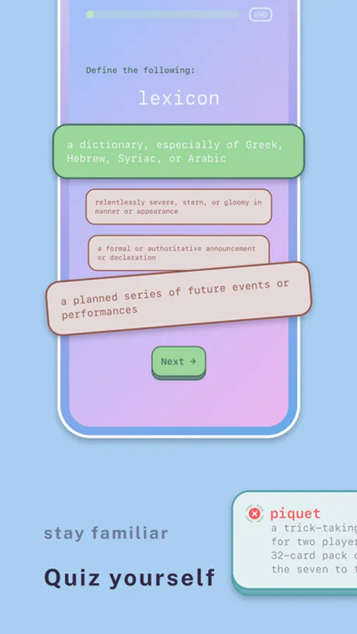 Lexitome includes a QUIZ that helps your learning by keeping you familiar with your vocabulary.