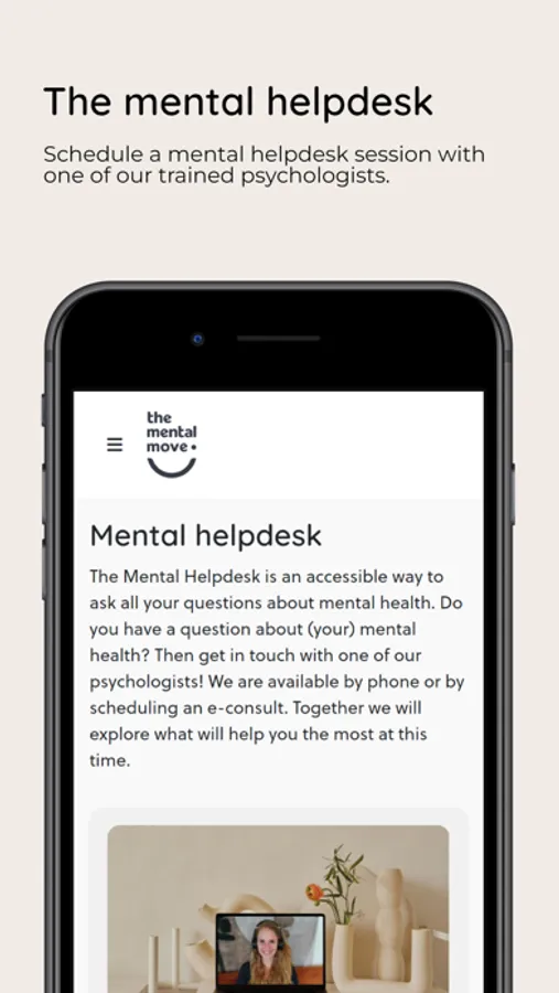 The Mental Move helps organizations improve the mental health of their employees. We do this with impactful and fast professional guidance through digital tooling: preventive self-help modules, a mental helpdesk, workshops and a preventive medical examination: online, fast and safe.