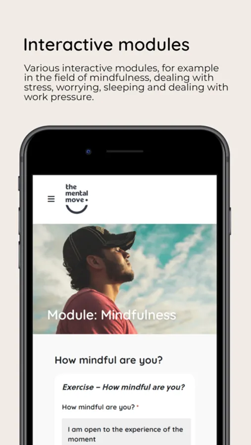 The Mental Move prevention platform is an app where employees can quickly get started, at any time and in any location, with improving their mental health through scientifically proven content, questionnaires and exercises.