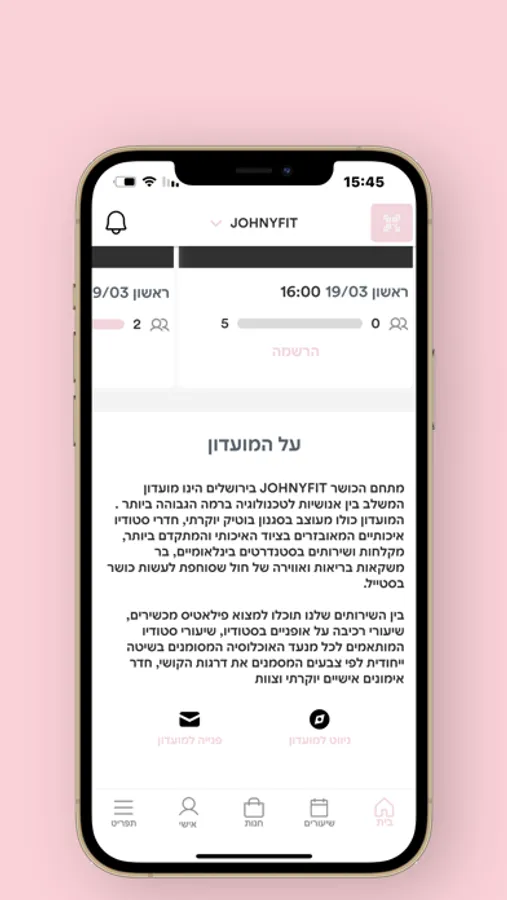 רישום מראש לשיעורים ( ספינינג, פילאטיס, אימונים פונקציונאלים, אימוני תחנות ועוד...), הוספת שיעור מועדף, הצגת המדריכים, הצגת רמות הקושי של כל שיעור, מערכת שעות של השיעורים, אופציה להוספת תזכורת לאימונים ביומן , מצב המנוי שלך, כניסה לרשימת המתנה, ניווט למועדון, עידכונים בזמן אמת ממתחם האימונים וכל זה בלחיצת כפתור אחת