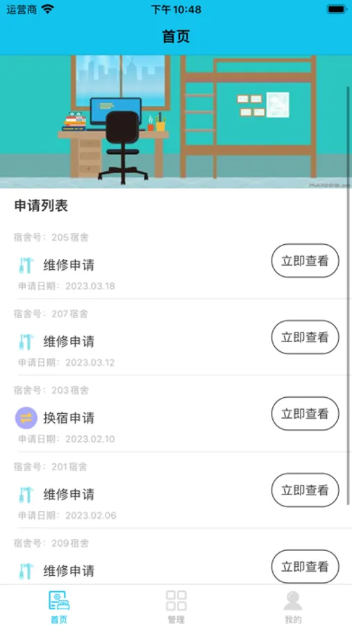 app是一款方便宿舍管理的工具,可以实现查看宿舍学生信息、查寝、审核学生申请等功能,方便宿管阿姨和大叔实现一手管理。