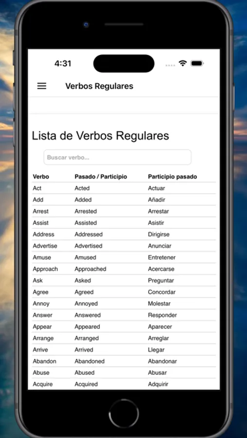 La aplicación incluye una lista amplia de verbos regulares e irregulares, junto con sus formas en el pasado y participio pasado. Los estudiantes podrían buscar verbos específicos, lo que les ayudaría a aprender y recordar con facilidad.