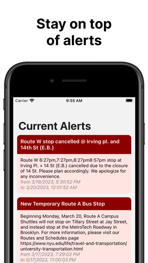 NYU Shuttles made easy. Track active shuttles. View scheduled departures. Know about alerts as they happen.