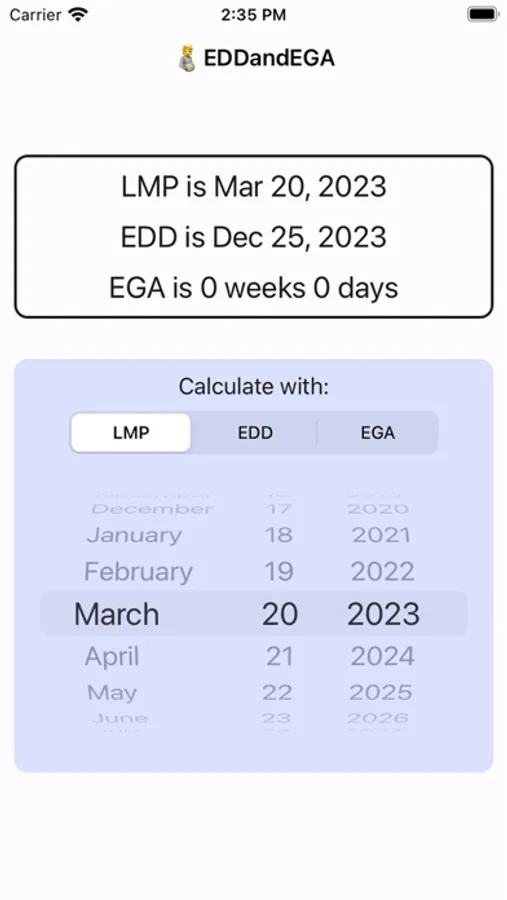Its a simple and straightforward app for calculating EDD and EGA. You can calculate using the LMP or using the USS provided EDD.