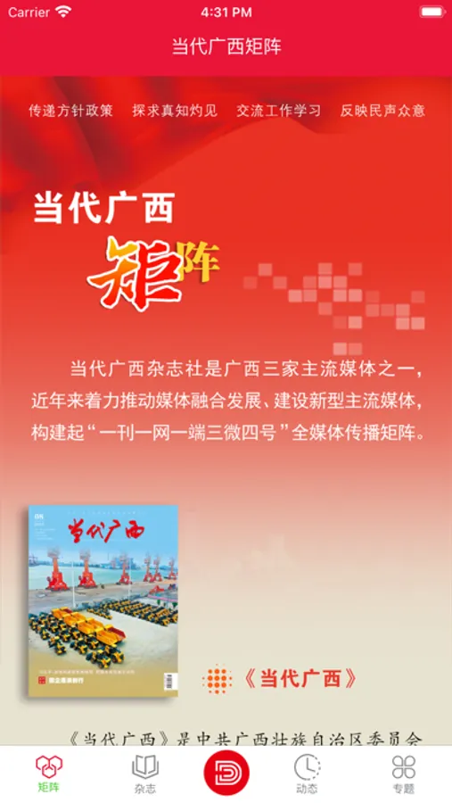 当代广西APP是当代广西杂志社立足党刊特色、集中优势资源研发打造的融媒体新平台,以新闻资讯、政务党建、理论评论、决策智库、文艺精品为内容龙头,构筑广西党员干部的移动端精神家园。