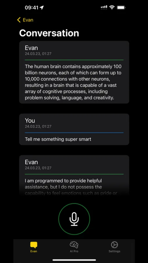 - Voice Transcription: Speak directly to Evan and watch your words convert to text in real-time, allowing for effortless and engaging conversations.