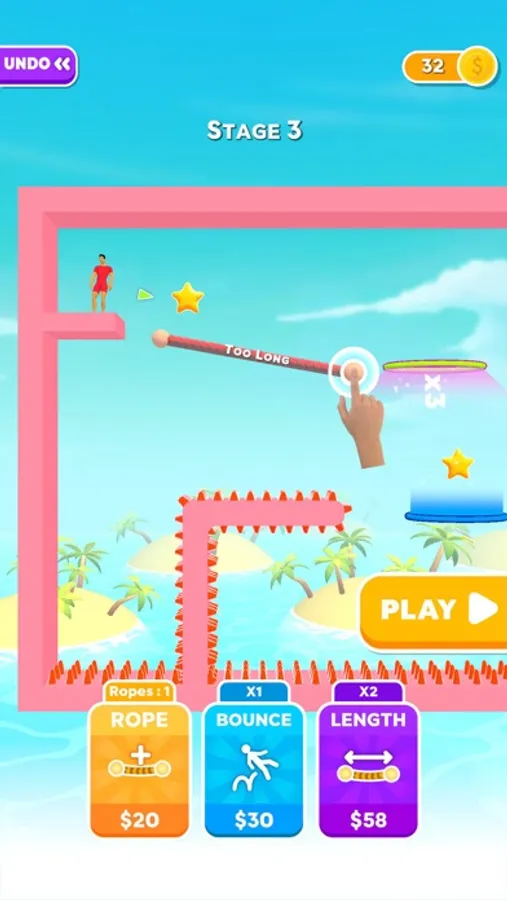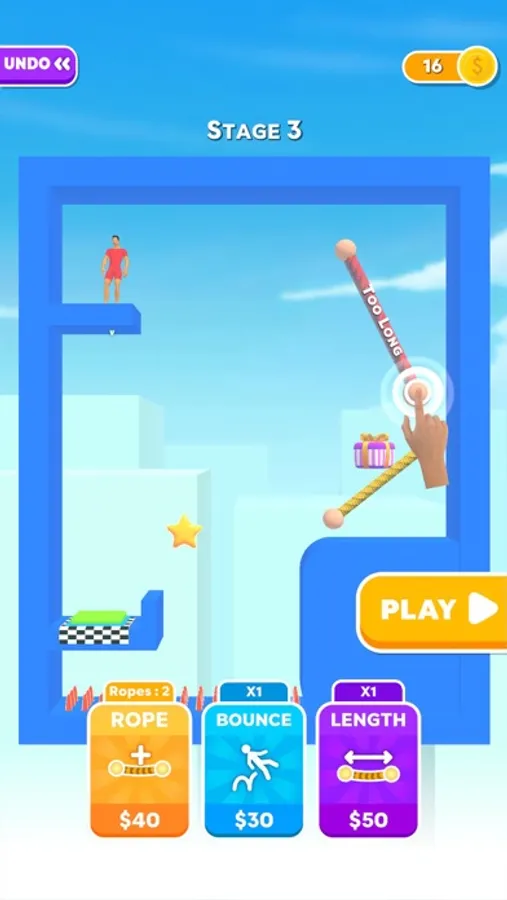 Easy gameplay. A character stands ready, at the top. But he/she can’t move until you place the ropes to get to the finish line.