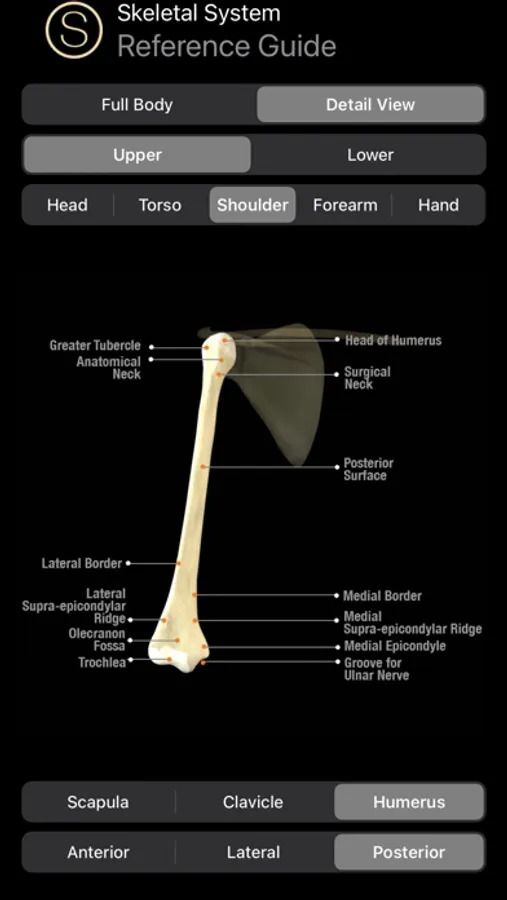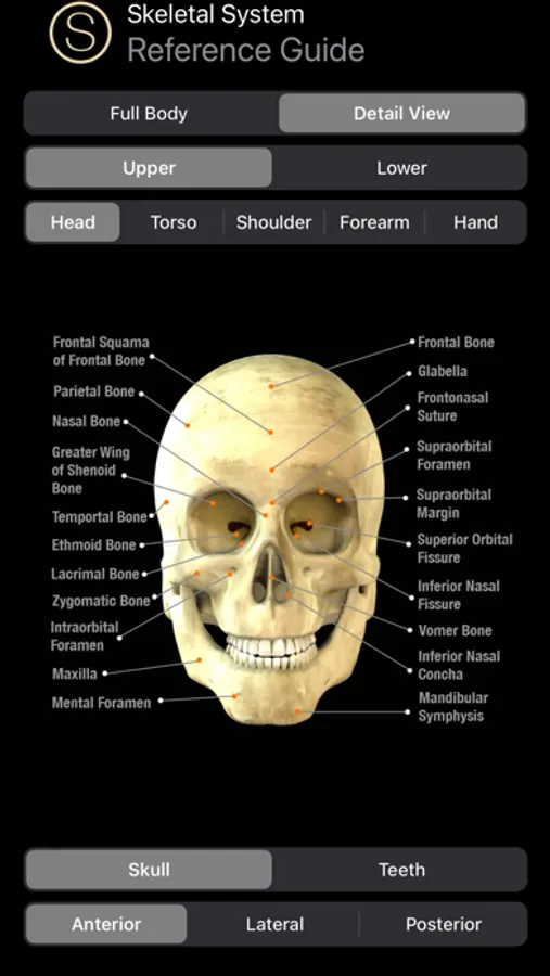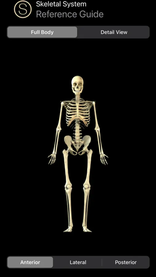 A complete skeleton reference guide will teach you bone anatomy from 3 different angles. Easily navigate all the regions of the human body. Test yourself on how well you know the skeleton by taking a multiple choice test.